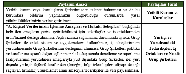 Yukarıda “A. Kişisel Verilerinizin İşlenme Amaçları ve Hukuki Sebepleri” başlığında belirtilen kişisel verilerinizi, aşağıdaki amaçlar doğrultusunda yine aşağıda belirtilen taraflarla paylaşıyoruz:
